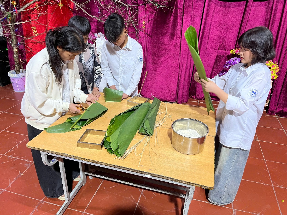 Một trong những hoạt động được mong chờ nhất là thi gói bánh chưng – nét đẹp truyền thống không thể thiếu mỗi dịp Tết đến, xuân về. Dưới sự hướng dẫn tận tình của thầy cô các đội thi đã cùng nhau chuẩn bị nguyên liệu, gói bánh bằng tất cả sự khéo léo, cẩn thận và tinh thần đoàn kết. Từng chiếc bánh vuông vắn không chỉ thể hiện sự khéo tay mà còn chứa đựng tình cảm, sự trân trọng đối với giá trị truyền thống của dân tộc. Kết quả chung cuộc, Giải Nhất thuộc về đội 8C2 – 9D2, để lại nhiều ấn tượng đẹp trong lòng thầy cô và các bạn học sinh.