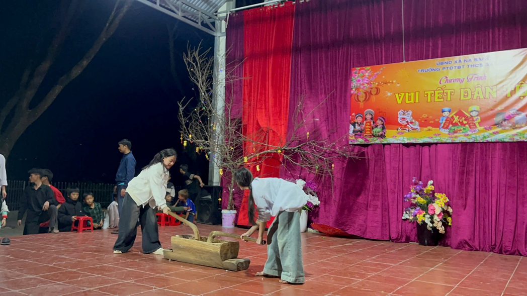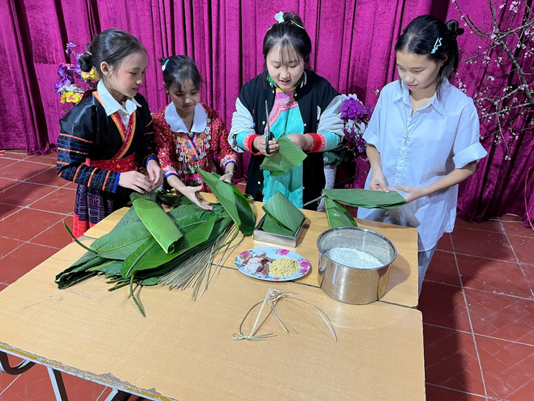Bên cạnh đó, hoạt động trải nghiệm giã bánh dày cũng mang đến cho học sinh những trải nghiệm vô cùng thú vị. Tiếng chày giã nhịp nhàng, sự phối hợp ăn ý của các em đã tạo nên bầu không khí rộn ràng, sôi nổi. Qua hoạt động này, học sinh không chỉ hiểu thêm về phong tục truyền thống của đồng bào dân tộc mà còn học được bài học về tinh thần lao động, sự kiên trì, đoàn kết và sẻ chia trong tập thể.