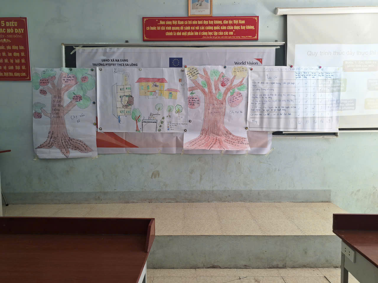 Để thu hút sự chú ý của phụ huynh “cây vấn đề” về bạo lực trẻ em trên không gian mạng được vẽ trên giấy khổ to. Trên các tán lá xanh được dán những tình huống thực tế như: bị bêu xấu trên mạng xã hội, bị ép buộc chia sẻ thông tin cá nhân, nhận lời mời kết bạn từ người lạ có hành vi đáng ngờ, hay bị lôi kéo vào các trò chơi độc hại. Ở phần rễ và thân cây ghi nguyên nhân dẫn đến bạo lực mạng như thiếu kỹ năng an toan số, tò mò với các mối quan hệ ảo, áp lực đồng trang lứa, hay sự thiếu giám sát kịp thời của người lớn.Trên ngọn cây – biểu tượng cho hy vọng là các giải pháp: trao đổi thường xuyên giữa cha mẹ và con, báo ngay cho thầy cô khi gặp tình huống nguy hiểm, không chia sẻ hình ảnh riêng tư, tôn trọng người khác trên mạng và lan tỏa thông điệp “Sử dụng mạng an toàn – nói không với bạo lực”.