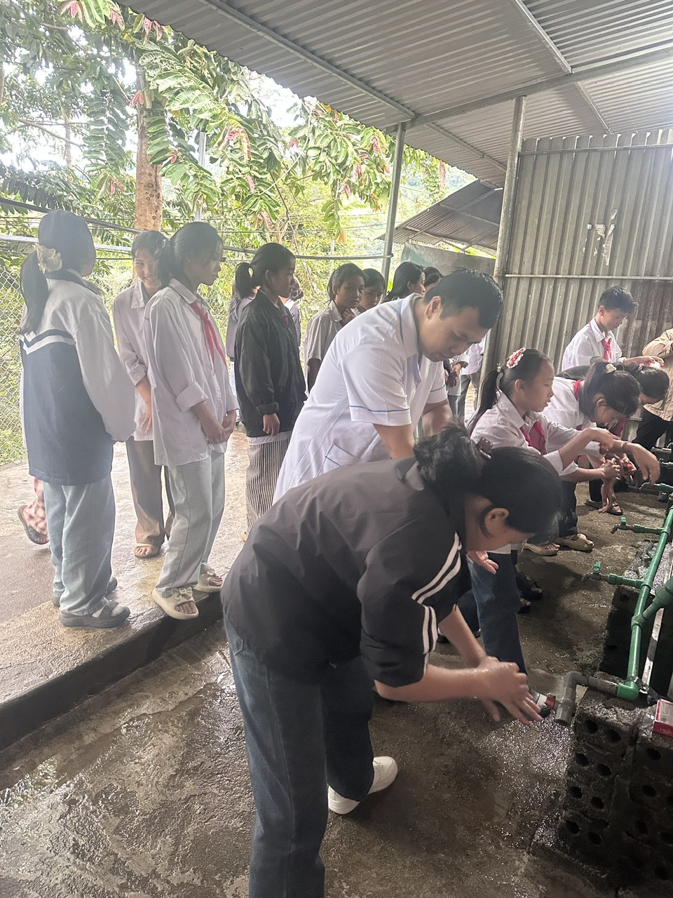 Học sinh trường PTDTBT THCS Sa Lông tham gia thực hành rửa taytheo hướng dẫn của cán bộ y tế